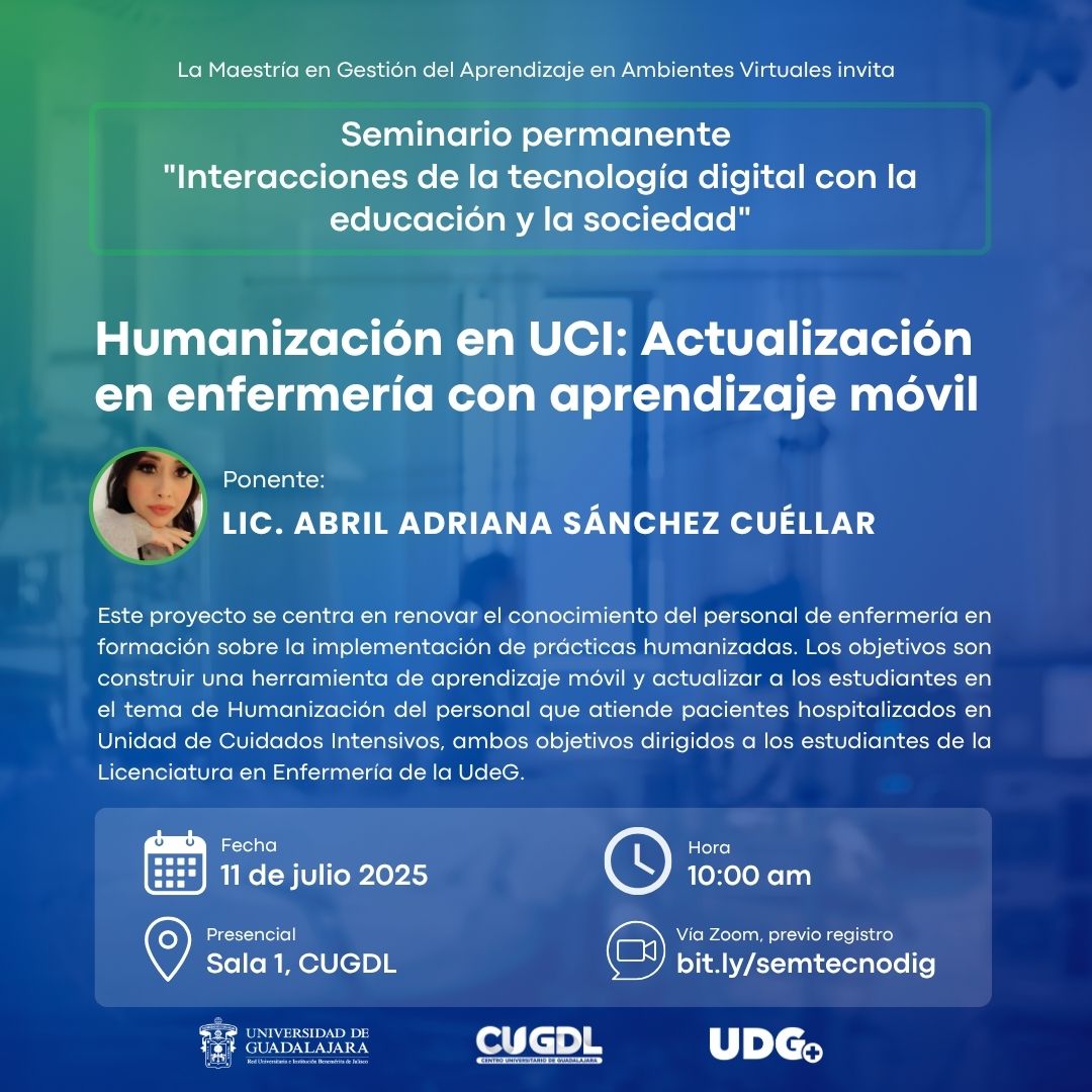 Resumen: Este proyecto de intervención se realiza con la finalidad de renovar el conocimiento del personal de enfermería en formación sobre la implementación de prácticas humanizadas. Los objetivos son construir una herramienta de aprendizaje móvil y actualizar a los estudiantes en el tema de Humanización del personal que atiende pacientes hospitalizados en Unidad de Cuidados Intensivos, ambos objetivos dirigidos a los estudiantes de la Licenciatura en Enfermería del CUCS de la Universidad de Guadalajara en Jalisco.