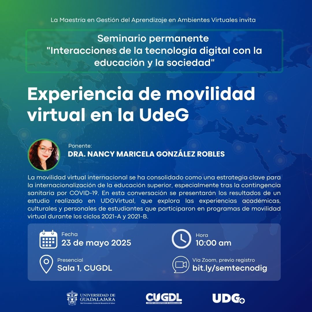 Resumen: La movilidad virtual internacional se ha consolidado como una estrategia clave para la internacionalización de la educación superior, especialmente tras la contingencia sanitaria por COVID-19. En esta conversación se presentarán los resultados de un estudio realizado en UDGVirtual, que explora las experiencias académicas, culturales y personales de estudiantes que participaron en programas de movilidad virtual durante los ciclos 2021-A y 2021-B. A partir de un enfoque cualitativo, se identificaron las percepciones en cuanto a la calidad de los contenidos, el diseño de actividades y los recursos proporcionados, así como un desarrollo significativo en habilidades como la autogestión, el trabajo colaborativo y el uso de tecnologías y el intercambio cultural. Esta conversación busca reflexionar sobre el potencial transformador de la movilidad virtual como parte de una educación más equitativa, interconectada y alineada con los Objetivos de Desarrollo Sostenible, ofreciendo claves para perfeccionar los modelos actuales de internacionalización.