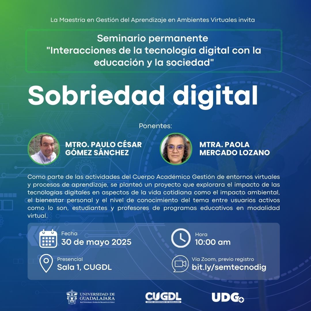 Como parte de las actividades del Cuerpo Académico Gestión de entornos virtuales y procesos de aprendizaje, se planteó un proyecto que explorara el impacto de las tecnologías digitales en aspectos de la vida cotidiana como el impacto ambiental, el bienestar personal y el nivel de conocimiento del tema entre usuarios activos como lo son, estudiantes y profesores de programas educativos en modalidad virtual.