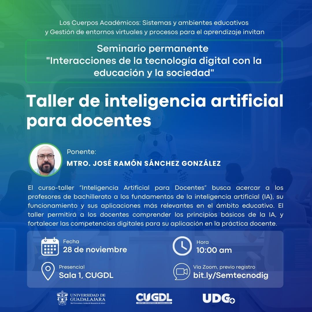 En este marco, el curso-taller “Inteligencia Artificial para Docentes” busca acercar a los profesores de bachillerato a los fundamentos de la inteligencia artificial (IA), su funcionamiento y sus aplicaciones más relevantes en el ámbito educativo. El taller permitirá a los docentes comprender los principios básicos de la IA, y fortalecer las competencias digitales para su aplicación en la práctica docente.